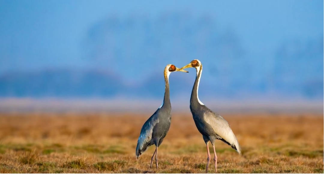 行为:除繁殖期成对活动外,多成家族群或小群活动,偶尔也见单独活动的,迁徙和越冬期间则多为数个或10多个家庭群组成的大群活动。行动机警,两翅扇动有力,飞行轻快。白枕鹤忠于爱情,恪守一夫一妻制,两只相爱的白枕鹤常常帮对方清理羽毛,甚至会有一些“亲吻”动作。