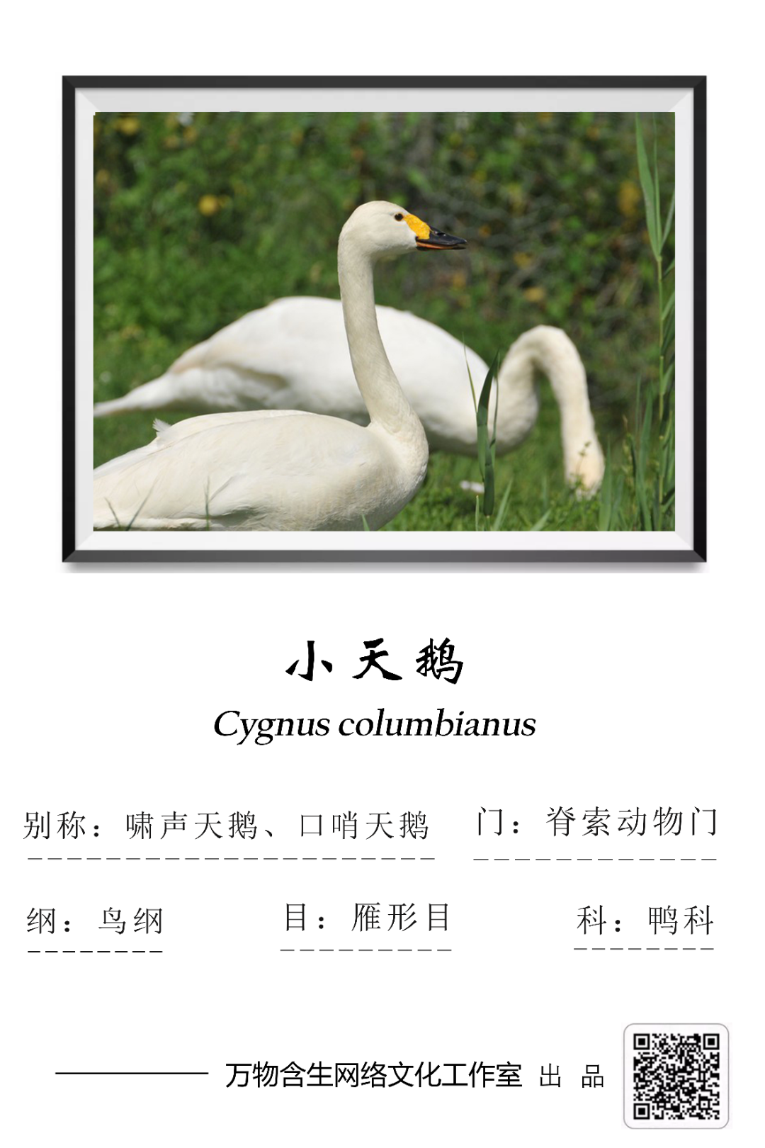 野外鉴别特征:大型水禽,体重4-7kg,体长110-135cm。全身洁白,嘴端黑色,嘴基黄色,外形和大天鹅非常相似,但体型明显较大天鹅小,颈和嘴亦较大天鹅短,嘴上黑斑大,黄斑小,黄斑仅限于嘴基两侧,沿嘴缘不前伸于鼻孔之下。