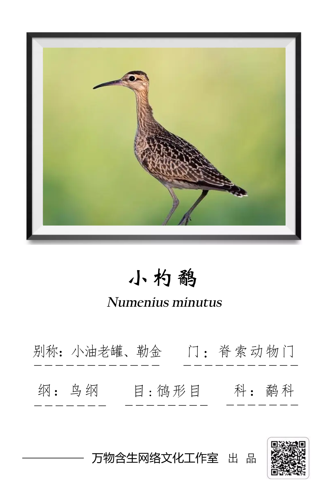 小杓鹬(Numenius minutus)鸻形目鹬科杓鹬属,别名小油老罐、勒金。小杓鹬列入《世界自然保护联盟濒危物种红色名录》(IUCN) 2016年 ver 3.1——无危(LC)。以及我国《国家重点保护野生动物名录》(2021年2月5日)二级。
