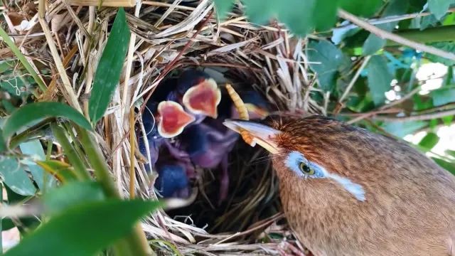 雌雄画眉择偶配对以后,便以“小家庭”为单位分散活动,寻找适合筑巢的地方,为繁殖后代做准备。它们的巢一般多筑于山丘上茂密的草丛、灌木丛中,以干草叶、枯草根和茎等编织而成,较为隐蔽。