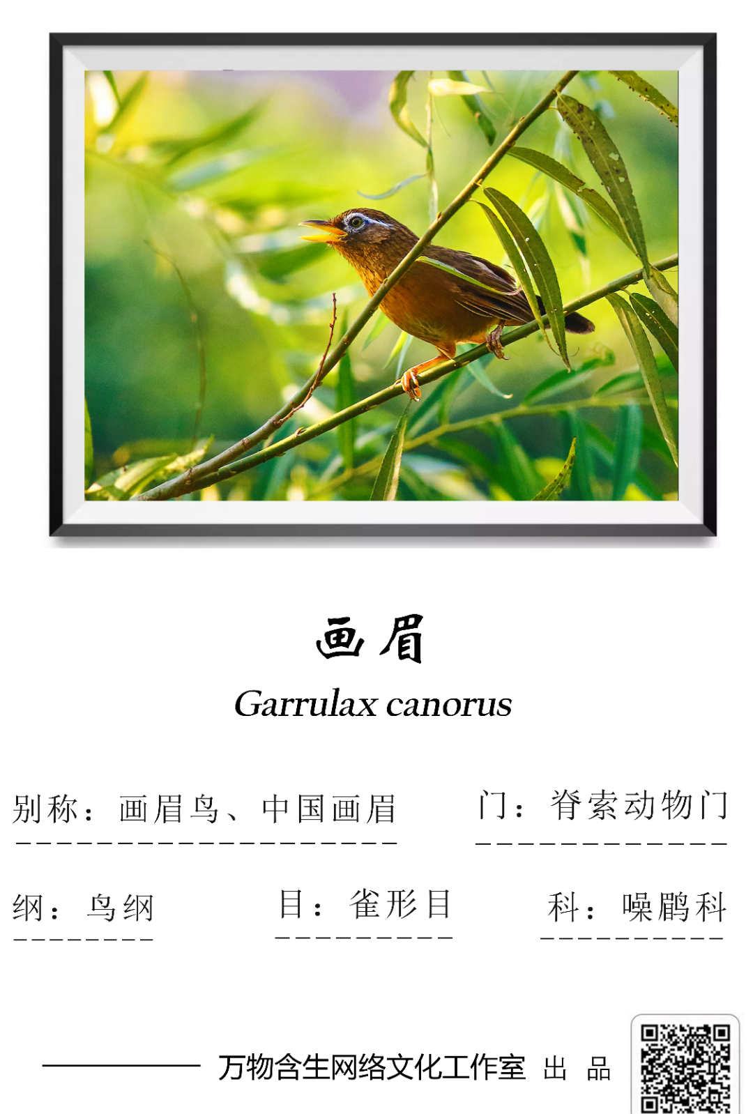 画眉(Garrulax canorus),鸟纲、雀形目,别名为画眉鸟、中国画眉。该物种被列入《世界自然保护联盟濒危物种红色名录》(IUCN)——无危(LC)和中国《国家重点保护野生动物名录》二级。