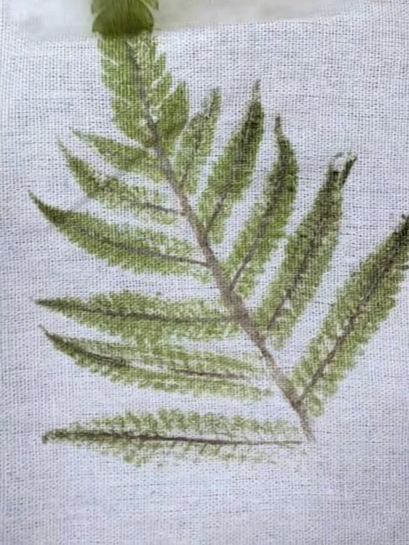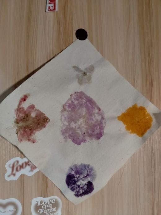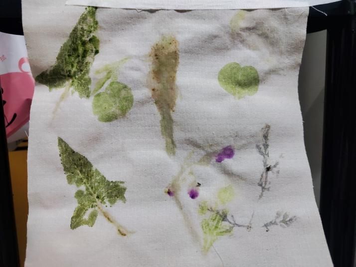 完成寻找植物之旅后,各小组成员拿到了制作印染画的材料,先将叶与花于明矾中浸泡一刻,再铺展开白色纱布,紧接着用胶带将标本固定,随之手起锤落 顷刻绿染成画。在不断精雕细琢地修释后,大家成功地创作出了一幅幅美丽的印染画,完成了对自然之美的最后升华。