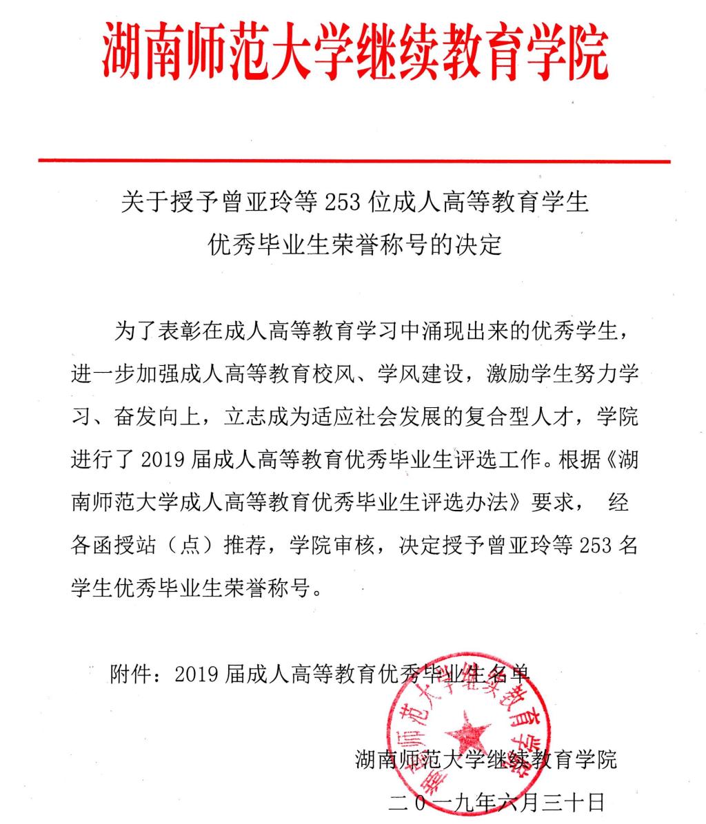 关于授予曾亚玲等253位成人高等教育学生优秀毕业生荣誉称号的决定